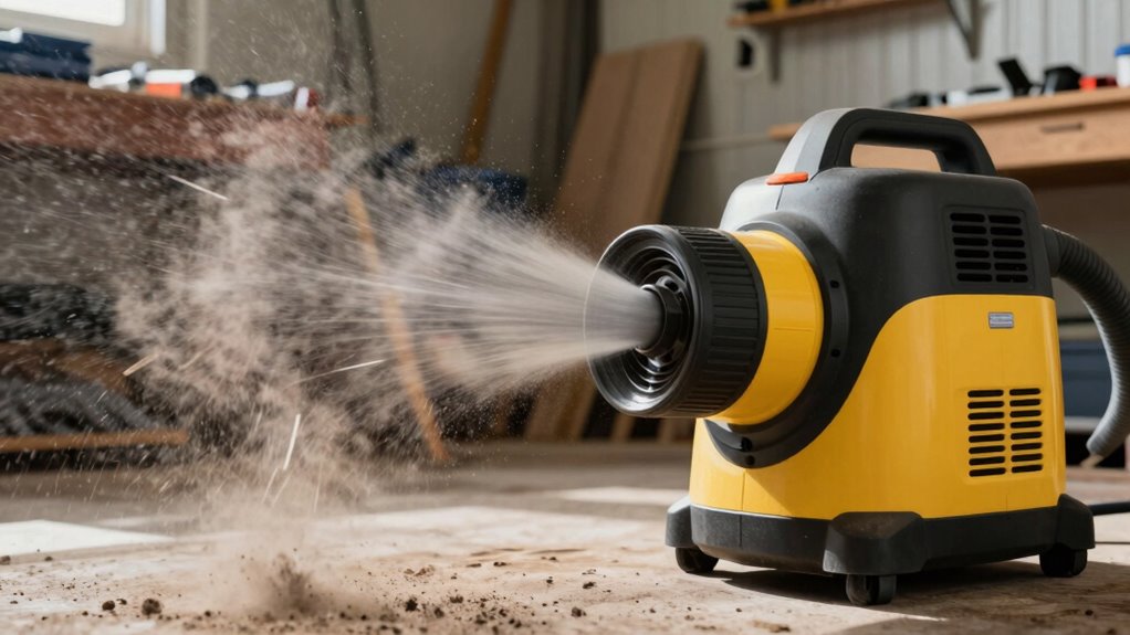 Did you know improper storage can lead to a 30% increase in dust blowout issues? If you don’t store your shop vac’s filter properly, dust can escape through the exhaust. To prevent this, always keep filters in a sealed container or clean, dry area to maintain dust containment. Proper storage guarantees your vacuum functions efficiently, reducing dust blowout and extending its lifespan.