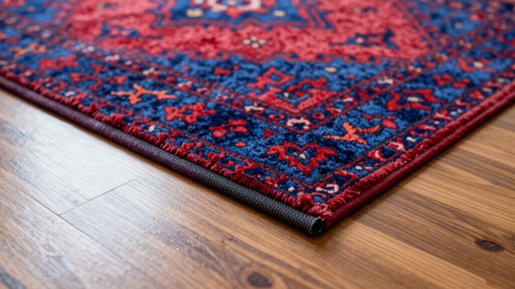 Pet activity can definitely affect your rug’s grip, especially if your pets love to run or scratch. Their playful behavior might cause the rug to shift or bunch up, so you need to think about pet safety and how your pet interacts with the rug. Using non-slip rug pads or tape helps maintain rug stability, ensuring your pet stays safe and the rug stays in place, regardless of their rug behavior.