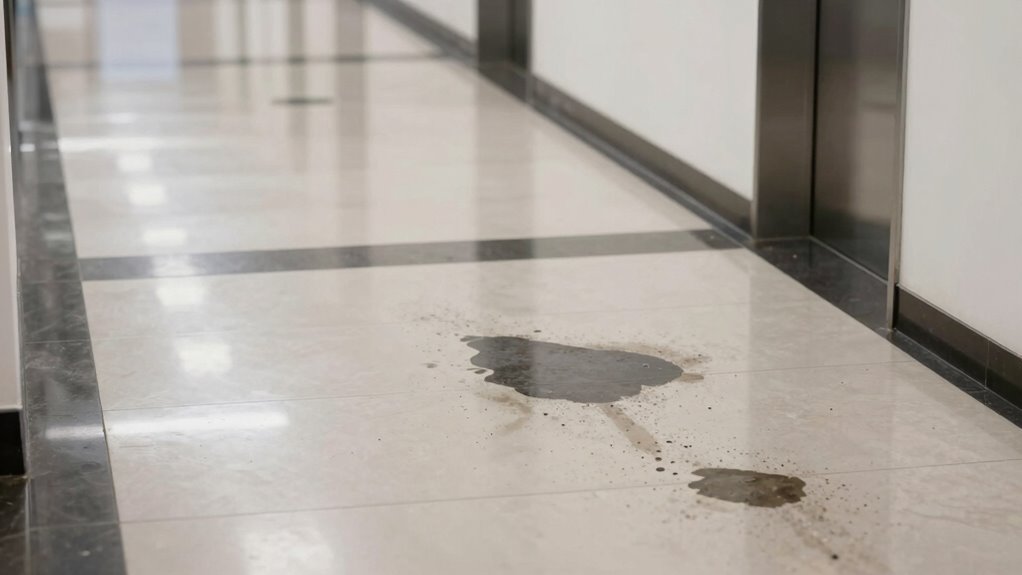 - Traffic lane stains result from vehicle fluids, dirt, and wear patterns accumulating in high-traffic hallway areas.