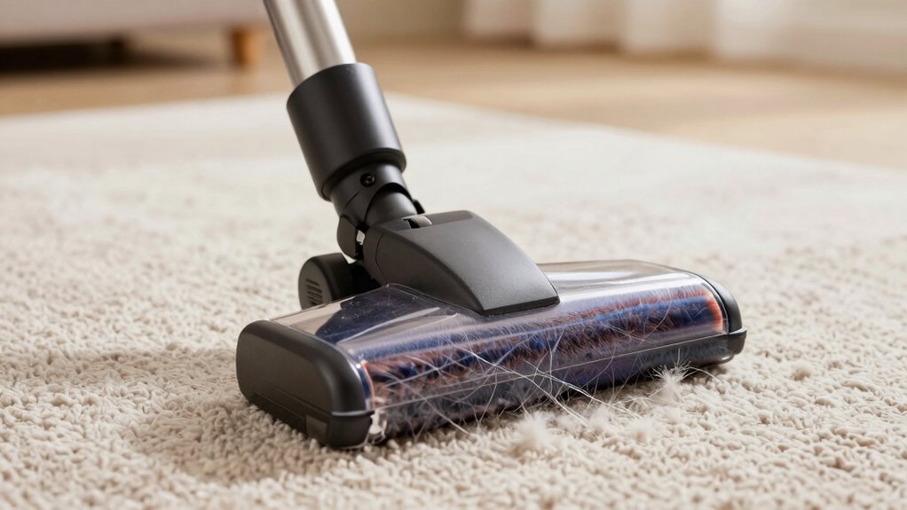 To protect your carpet fibers, start by adjusting the suction power to a lower setting, preventing unnecessary stress on the fibers. Next, switch the brush roll to the appropriate setting for your carpet type, and make sure you’re using the correct height adjustment. Properly setting your vacuum can help reduce loose threads and keep your carpet looking its best. Additionally, understanding carpet fiber types can help you choose the best vacuum settings for your specific flooring. Using a vacuum with gentle cleaning modes can further minimize damage to delicate fibers and preserve the longevity of your carpet.