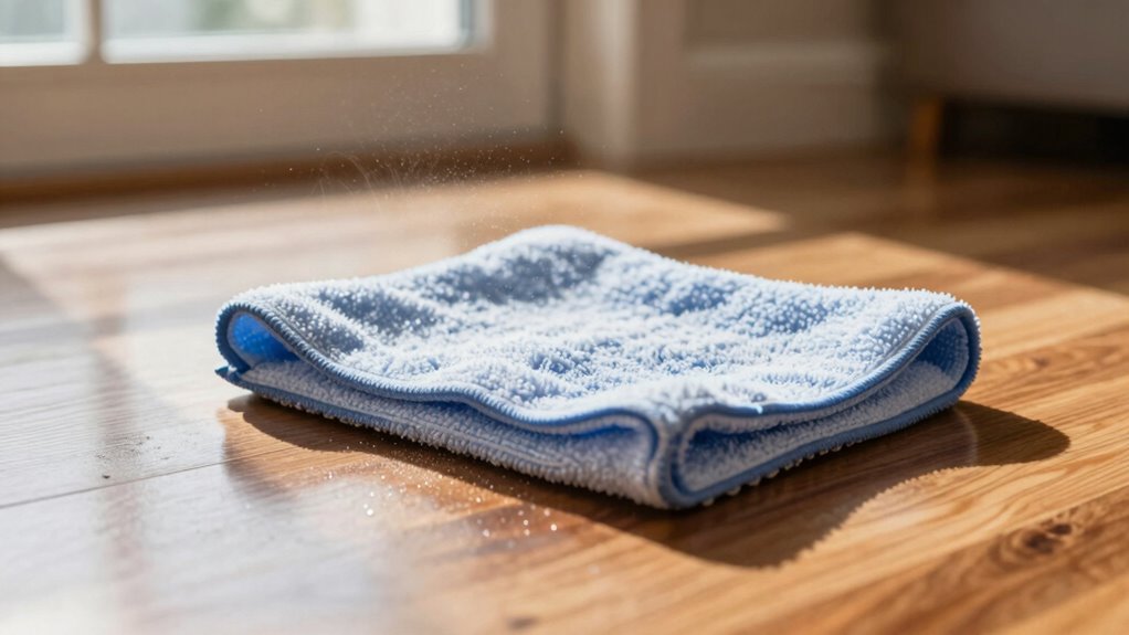 Have you considered how sticky tools can dramatically speed up dust cleanup? These tools are designed to attract dust residue effortlessly, thanks to static cling. A microfiber cloth or lint roller traps fine dust particles quickly without spreading them around. Unlike traditional brooms or dustpans, sticky tools remove dust on contact, minimizing the risk of chasing particles into the air. They’re especially effective on smooth surfaces like electronics, furniture, and window sills. Simply press the sticky surface against the dust, and static cling pulls in even the tiniest particles. This method reduces cleanup time and ensures a thorough job. Keep a lint roller or microfiber cloth handy for fast, efficient dust removal—making your cleaning routine smoother and dust-free in no time. Additionally, static electricity enhances the effectiveness of these tools by attracting even finer dust particles.