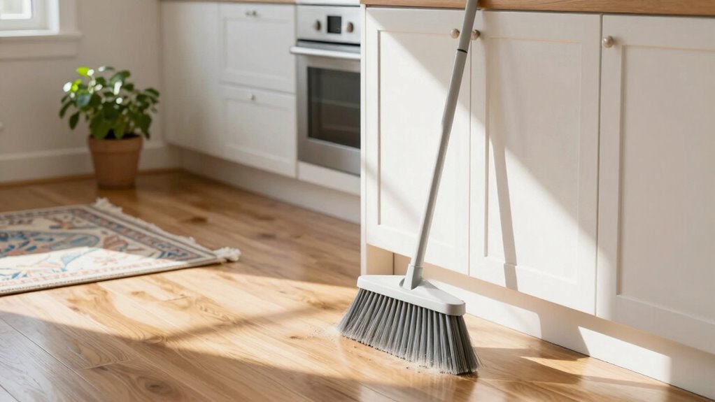 You should sweep your kitchen floors daily as part of your routine. This consistent floor maintenance helps keep dirt and crumbs from piling up, making your kitchen look tidier. If you’re cooking often or have pets, you might find it beneficial to sweep even more frequently. By staying on top of it, you’ll save time and effort later, ensuring your kitchen remains a clean and welcoming space for you and your family.