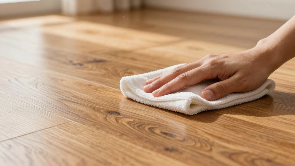 Stubborn stains can seem like they’ll never come off, but with gentle stain removal, you can save your finish like a hero saving a masterpiece. Use a soft cloth dampened with a mixture of mild soap and water, gently working on the stain. Avoid harsh chemicals, and always dry immediately. This approach preserves your finish while effectively removing stains, keeping your engineered hardwood looking pristine and protected.
