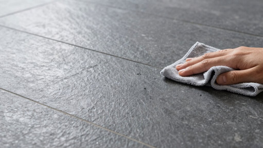 Yes, you can use vinegar to clean slate floors safely, but do so cautiously. Vinegar is an acidic cleaner, so it’s best to dilute it with water to prevent damage. Avoid using it frequently, as overuse can erode the stone. After cleaning, consider sealing techniques to protect your slate and maintain its appearance. Always test a small area first to confirm it doesn’t cause any discoloration or harm.