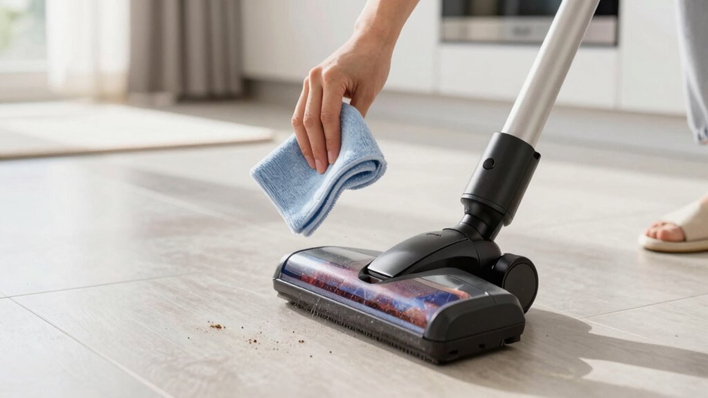 Think of your floors as battlegrounds against dust mites. To win, vacuum thoroughly using proper techniques, overlapping passes, and slow movements. Use HEPA filters to trap allergens effectively. Install dust mite barriers like allergen-proof covers on carpets and rugs, and wash bedding regularly to prevent mites from thriving. This approach keeps your floors cleaner and reduces allergy symptoms, creating a healthier home environment.