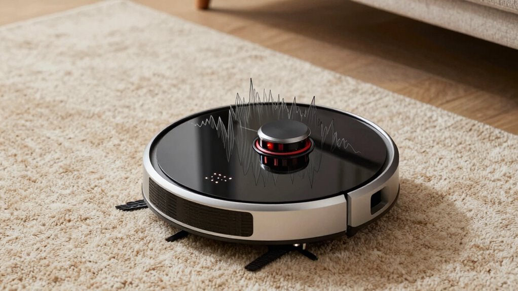 Environmental factors can definitely increase your robot vacuum’s noise. If your vacuum is on uneven floor placement, it might work harder and get louder. Obstacle interference, like tangled cords or clutter, can also make it struggle, causing extra noise. Make sure your cleaning path is clear and the vacuum is on a stable surface. Addressing these factors helps reduce noise and keeps your vacuum running smoothly.