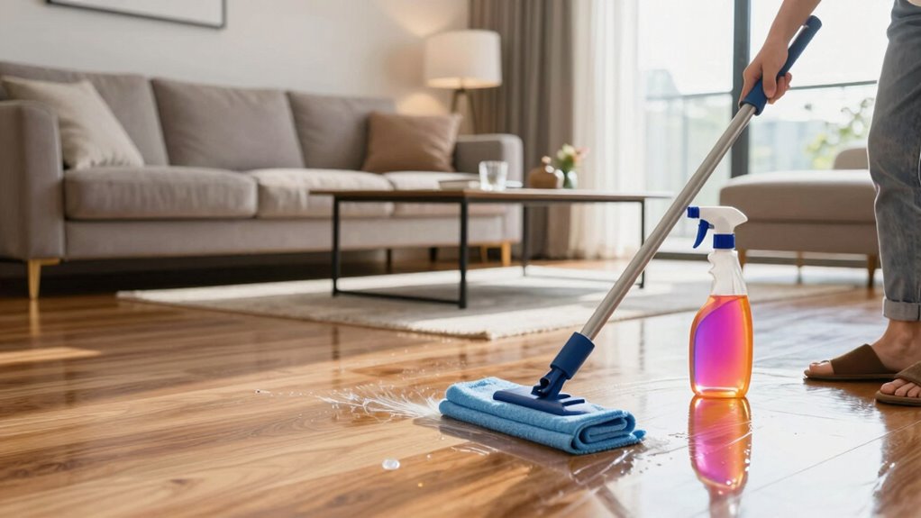 Grab your essential cleaning tools, like a mop and broom, so you’re ready to act quickly. Opt for multi-purpose products to save time and effort on different surfaces. Have disposable cloths on hand for fast, no-fuss wiping to give your floor an instant refresh. Incorporating eco-friendly and sustainable cleaning solutions can also make your quick makeover more environmentally conscious. Using appropriate cleaning equipment ensures you can efficiently tackle various messes in a short amount of time. Additionally, choosing Free Floating cleaning methods can help you maintain a clutter-free space efficiently. Being familiar with cleaning techniques can further speed up your quick transformation when time is limited. Understanding vetted cleaning products and methods guarantees safety and effectiveness during your speedy cleanup.