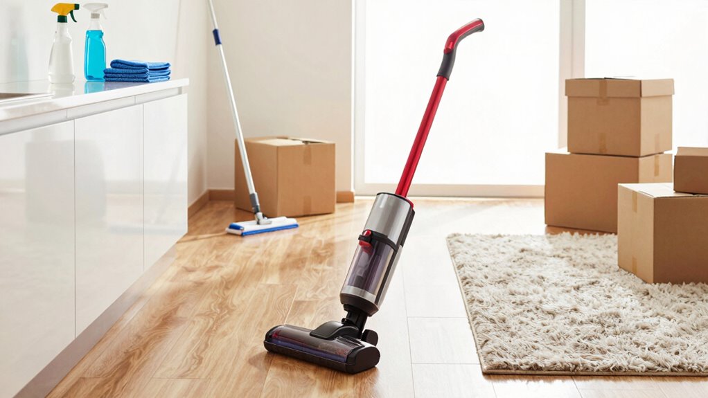 Selecting the right tools and cleaning products is essential to ensuring your move-in floor cleaning is effective and safe. Start with a good vacuum equipped with the appropriate attachments—such as crevice tools or upholstery brushes—to thoroughly remove dust and debris from different floor surfaces. Choose cleaning solutions suited for your floor type: a gentle, pH-neutral cleaner for hardwood, or a stronger disinfectant for tile or vinyl. Avoid harsh chemicals that could damage flooring or leave residues. Keep a variety of vacuum attachments handy to reach corners, edges, and underneath furniture. Using the right tools and products helps you clean efficiently, prevents damage, and leaves your new space fresh and ready for unpacking. Incorporating proper cleaning techniques ensures deep cleaning and prolongs the lifespan of your flooring. Additionally, selecting appropriate cleaning methods can help you achieve a more thorough and efficient cleaning process. Considering the materials of your floors can guide you in choosing the most suitable cleaning approach. Moreover, understanding how different flooring materials respond to cleaning can prevent accidental damage and maintain their appearance over time.