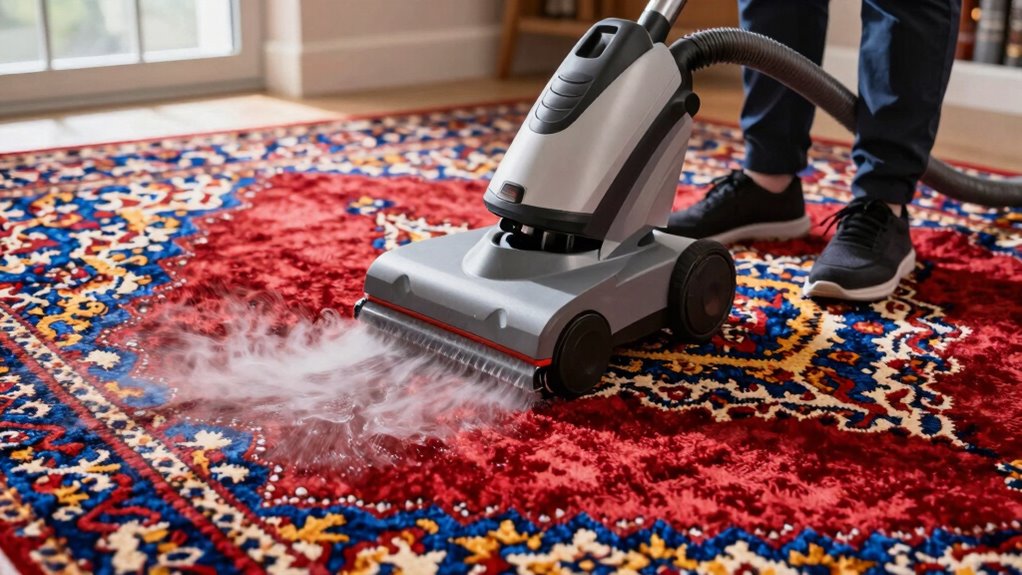 When selecting a carpet cleaner for delicate area rugs, paying attention to specialized equipment features is essential because they directly impact cleaning effectiveness and rug safety. Adjustable brushroll speeds allow gentle cleaning on fragile fibers, preventing damage. Many models have separate or adjustable suction settings to avoid over-wetting, which can harm sensitive materials. Targeted tools like handheld spot-cleaners or gentle spray nozzles improve precision, ensuring thorough cleaning without risking the integrity of the rug. Some machines include specialized rinse and neutralizing formulas designed explicitly for delicate or antique rugs, enhancing cleaning results while preserving materials. Advanced units may offer fast-drying or dry-only modes, reducing moisture retention and minimizing mold or mildew risks. These features help you clean effectively without compromising your rug’s condition.