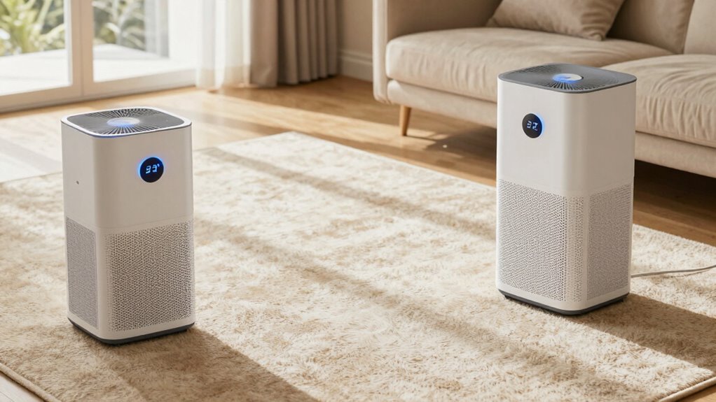 Integrating air purification features into a dehumidifier can substantially improve indoor air quality while drying your carpet. HEPA filters capture tiny particles like dust, mold spores, and allergens, reducing health risks and preventing mold growth. Activated carbon filters absorb odors and VOCs from damp carpets and cleaning products, making the environment fresher. These features help eliminate airborne contaminants that can be released during the drying process, especially in humid conditions. By reducing mold spores and pollutants, air purification enhances the overall indoor air quality and promotes a healthier space. Additionally, combining dehumidification with air purification can speed up drying times by removing moisture and airborne contaminants simultaneously. This dual functionality ensures a cleaner, safer, and more comfortable environment during and after carpet drying.