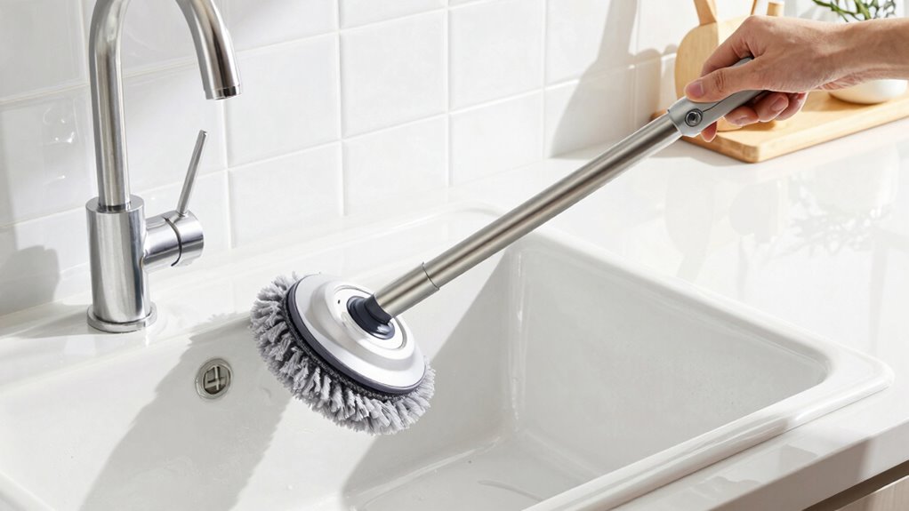 Choosing an electric scrubber with adjustable handles can make a big difference in how comfortably and effectively I clean sinks and tiles. Adjustable handles let me customize the length from about 12 inches to over 54 inches, making it easy to reach high spots or tight corners without straining. Telescopic or multi-section handles reduce the need to bend or kneel, lowering physical fatigue during extended cleaning sessions. Handle rotation and extension also give me precise control, allowing me to maneuver around edges and corners with ease. Proper adjustability guarantees ergonomic use, helping me avoid discomfort and fatigue. Overall, these features boost my cleaning efficiency and comfort, making my sink and tile cleaning tasks much less cumbersome.