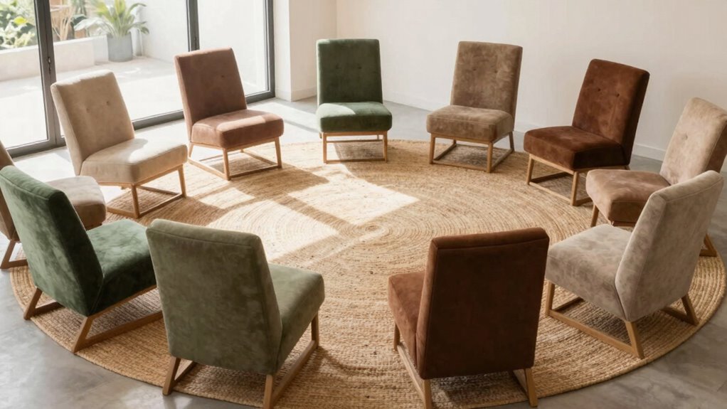 Think of your chair as a loyal friend—comfort and durability matter most. I recommend chairs made from high-density foam and sturdy, breathable fabrics like memory foam or thick cotton. These materials offer long-lasting support without sacrificing comfort. Metal or hardwood frames also add durability. Choosing well-stitched seams and quality padding guarantees your chair remains cozy and supportive through countless meditation sessions and other relaxing activities.