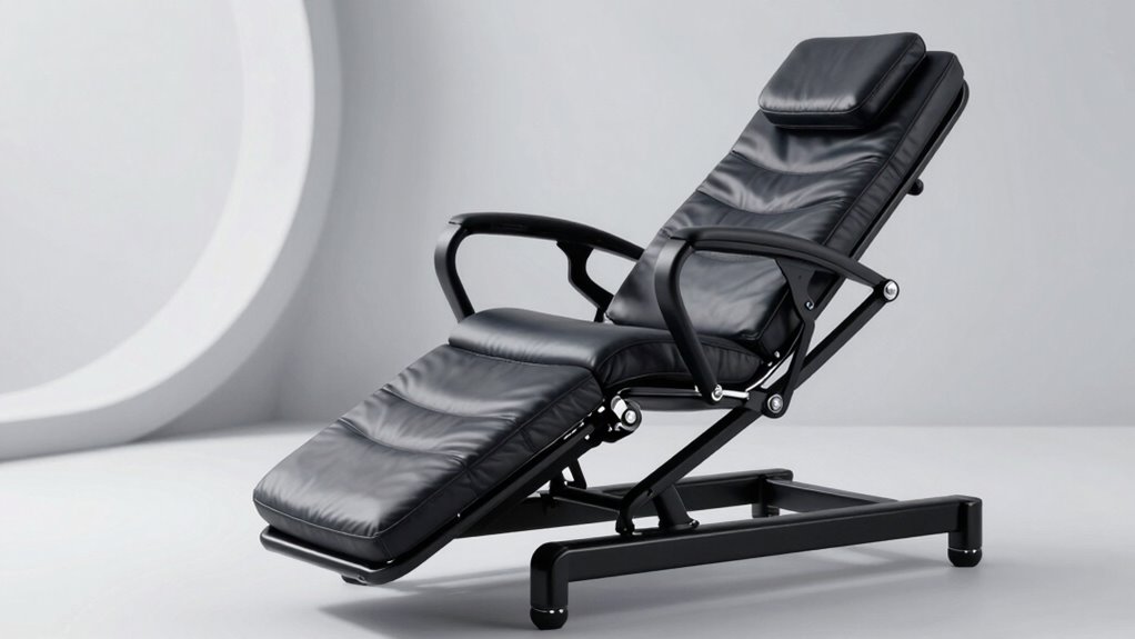 Adjustable inversion angles are a key feature to contemplate because they let you customize your therapy for maximum comfort and effectiveness. With tilt ranges typically from 20° to 90°, you can target specific areas of your spine and control the intensity of decompression. Many tables have safety tethers or preset angle markings, making it easy to set and maintain your desired position precisely. Being able to vary the angle enhances comfort and safety, helping prevent over-inversion or strain, especially for beginners or those with medical concerns. A secure locking mechanism ensures stability during use, giving you confidence in your sessions. Overall, adjustable angles provide personalized control, making inversion therapy safer, more comfortable, and more effective for spinal health.