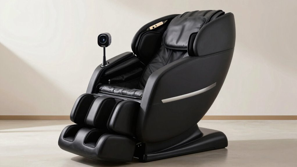 Body scan technology plays a essential role in customizing your massage experience by automatically detecting your shoulder height, back curvature, and body shape. When activated, it quickly performs a full-body scan in about 10 to 20 seconds, ensuring precise targeting of massage zones. This data allows the system to adjust roller speed, pressure, and airbags for a truly personalized massage. Advanced sensors can even identify specific tension points, enabling targeted relief where you need it most. Regular updates to the scan algorithms improve accuracy, helping the chair adapt seamlessly to different users’ physiques. With this technology, you don’t have to manually adjust settings; instead, the chair intuitively customizes the massage, maximizing comfort and effectiveness every time. It’s a key feature for a truly tailored massage experience.