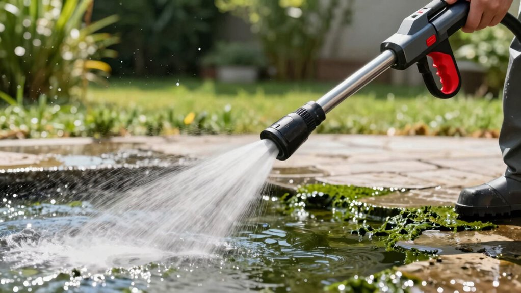 To protect the environment while removing algae, I focus on using biodegradable, chemical-free detergents and eco-friendly cleaning solutions. I choose pressure washers with adjustable pressure settings to avoid damaging nearby plants or grass. Using natural or peroxide-based cleaning agents helps minimize ecological impact, so I avoid harsh chemicals like chlorine or phosphates. Proper application techniques are vital—thorough rinsing and preventing runoff into water bodies safeguard local ecosystems. I also look for equipment with low-pressure or surface cleaner attachments to reduce water use and chemical reliance. By prioritizing these features, I guarantee effective algae removal without harming the environment, making my cleaning process both safe and sustainable. This approach aligns with eco-conscious practices and helps protect natural resources.