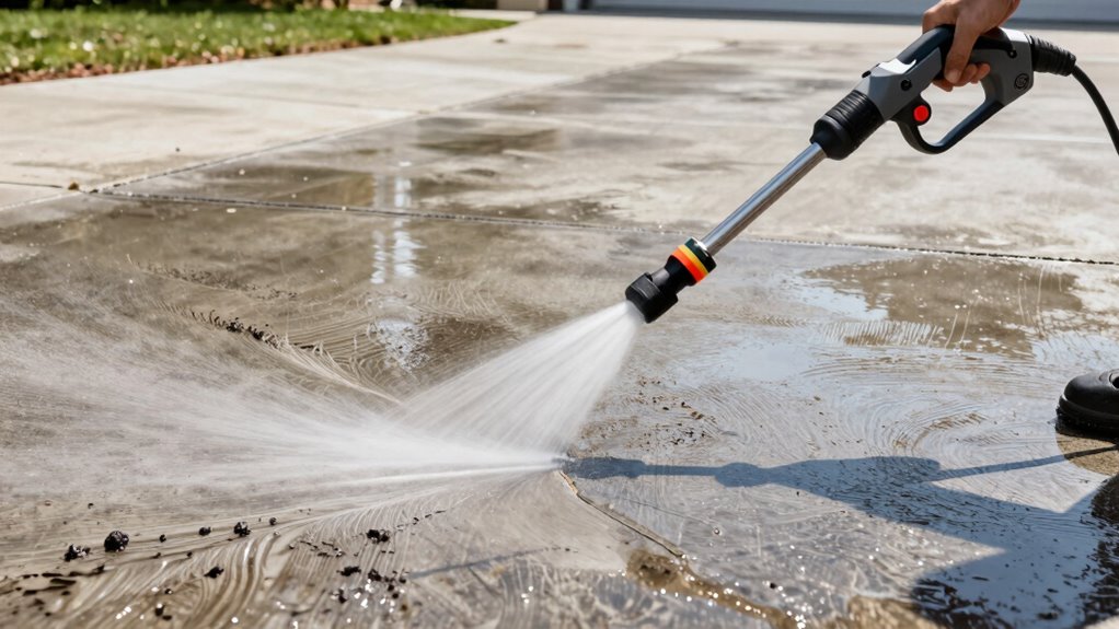 Think of accessories as your cleaning toolkit’s secret weapons. I recommend a turbo nozzle for powerful, swirling water jets that cut through grime like a hot knife through butter. A surface cleaner attachment speeds up large areas and guarantees even results. Additionally, using detergent tanks helps loosen stubborn dirt before pressure washing. These accessories turn a good job into a great one, making your driveway sparkle like new.