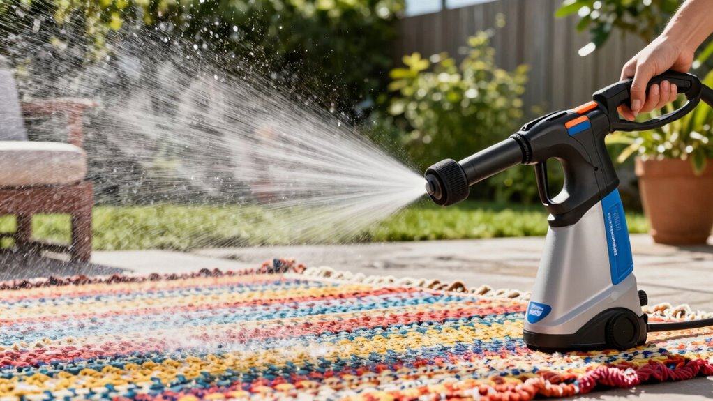 Choosing the right water pressure is essential for effectively cleaning outdoor rugs without causing damage. For most outdoor rugs, a PSI between 1300 and 2000 works well to remove dirt and stains without harming the fibers. Too much pressure, above 2000 PSI, risks tearing or fraying delicate materials, so adjusting the PSI accordingly is crucial. Using a lower pressure with a wider spray nozzle helps prevent damage while still cleaning surface dirt efficiently. Proper water pressure makes the process quicker and reduces the need for excessive scrubbing. Before starting, always test a small, hidden area to find the ideal setting that cleans well without harming the rug’s surface. This careful approach ensures your outdoor rug stays clean and intact.
