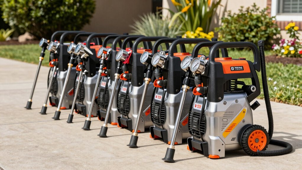 Have you ever wondered how to choose a pressure washer that delivers the right cleaning power? The key is understanding power and pressure levels. Higher PSI, like 3000 or more, means stronger cleaning for tough jobs like concrete or grime removal. Flow rate, measured in GPM, affects how fast you can clean—more GPM means more water volume and quicker results. Adjustable pressure settings let you tailor the cleaning strength to different surfaces, reducing the risk of damage. A Total Stop System helps by shutting off the pump when you release the trigger, saving energy and extending the machine’s life. Maintaining consistent pressure levels guarantees efficient cleaning and minimizes unnecessary wear. Balancing PSI, GPM, and adjustability helps you choose a pressure washer suited to your specific needs.