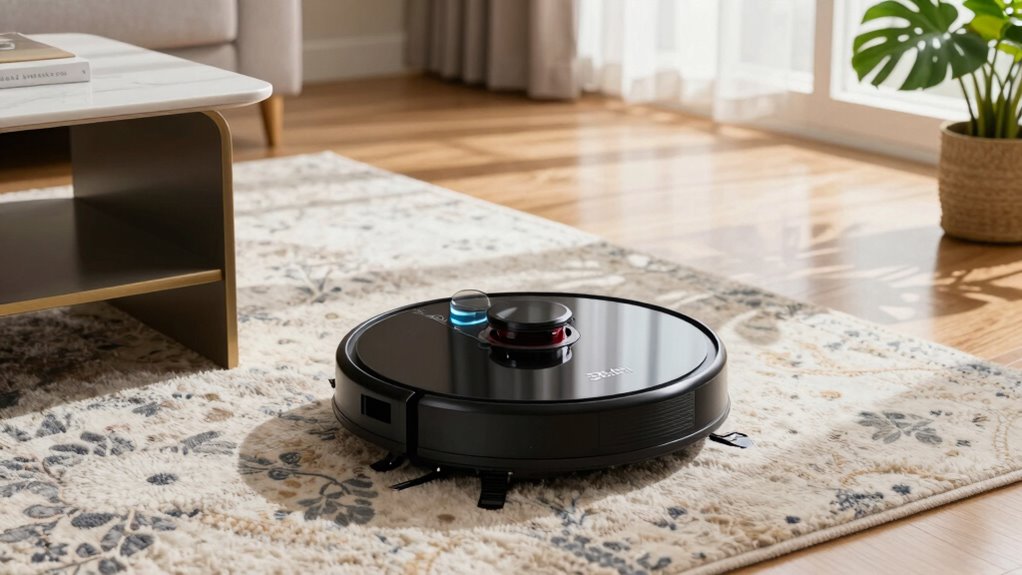 Robot vacuums handle different carpet types by using sensors that detect pile height and adjust cleaning accordingly. I’ve noticed that high-end models automatically lift their mops or switch to suction mode when on thicker carpets, ensuring effective cleaning without damage. They often switch between modes seamlessly, allowing me to clean various surfaces without manual adjustments. This smart adaptability makes my cleaning routine much easier and more efficient.