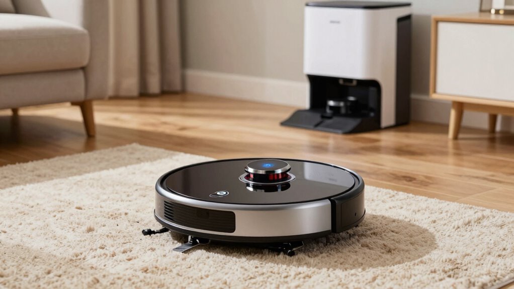 They typically perform quite well on uneven or textured flooring, especially models with adjustable brushes and strong suction. I’ve noticed that self-emptying vacuums with adaptive navigation can better manage bumps and rough patches. However, I recommend checking specific product specs to verify they’re designed for challenging surfaces. Overall, I find these vacuums effective, but some may require manual intervention on very uneven or heavily textured areas.