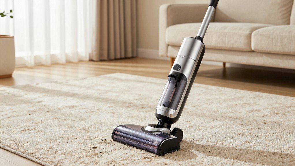 A high-quality filtration system is essential for effective deep cleaning because it guarantees that dust, allergens, and microscopic debris are captured rather than released back into the air. HEPA filters are ideal, trapping 99.97% of particles as small as 0.3 microns, which considerably improves indoor air quality. This is especially important if you or family members suffer from allergies or asthma. Sealed systems prevent dust from escaping during vacuuming, ensuring all debris stays contained. Regularly maintaining and replacing filters keeps the system performing at its best. The filtration system’s design directly impacts its ability to pick up pet dander, dust mites, and allergens during deep cleans. Choosing a vacuum with a robust filtration system ensures a healthier, cleaner home environment.