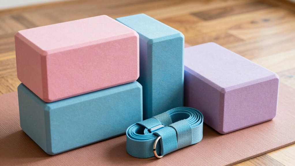 When selecting yoga props like premium blocks and straps, I consider factors such as material durability, support level, and versatility to guarantee they meet my practice needs. Size and portability matter too, especially if I want to practice at home or take supplies on the go. Ultimately, I weigh the price against the value to find options that are both affordable and long-lasting.